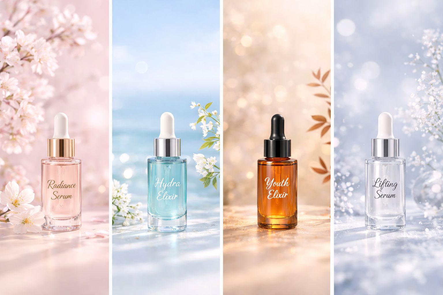 40代敏感肌の季節ケアを表現した四季のイメージ背景。春の桜、夏の白い花、秋のやわらかなベージュフラワー、冬の繊細な白い花が淡く配置された上品なビジュアル